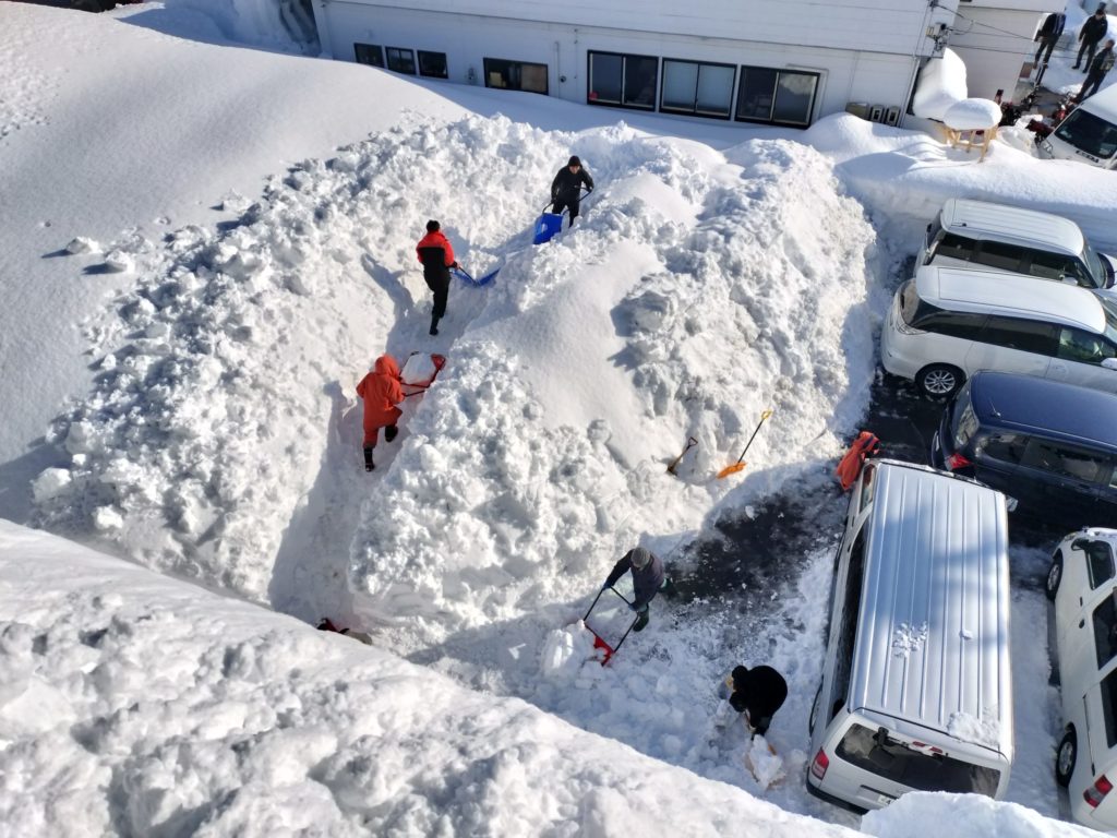 本作業は社員12名により行い、屋根上にてスノーダンプ及びスコップを使用して積雪を地上へ下ろし、地上待機者がこれを雪捨て場まで運搬する方法により実施しました。