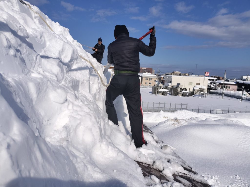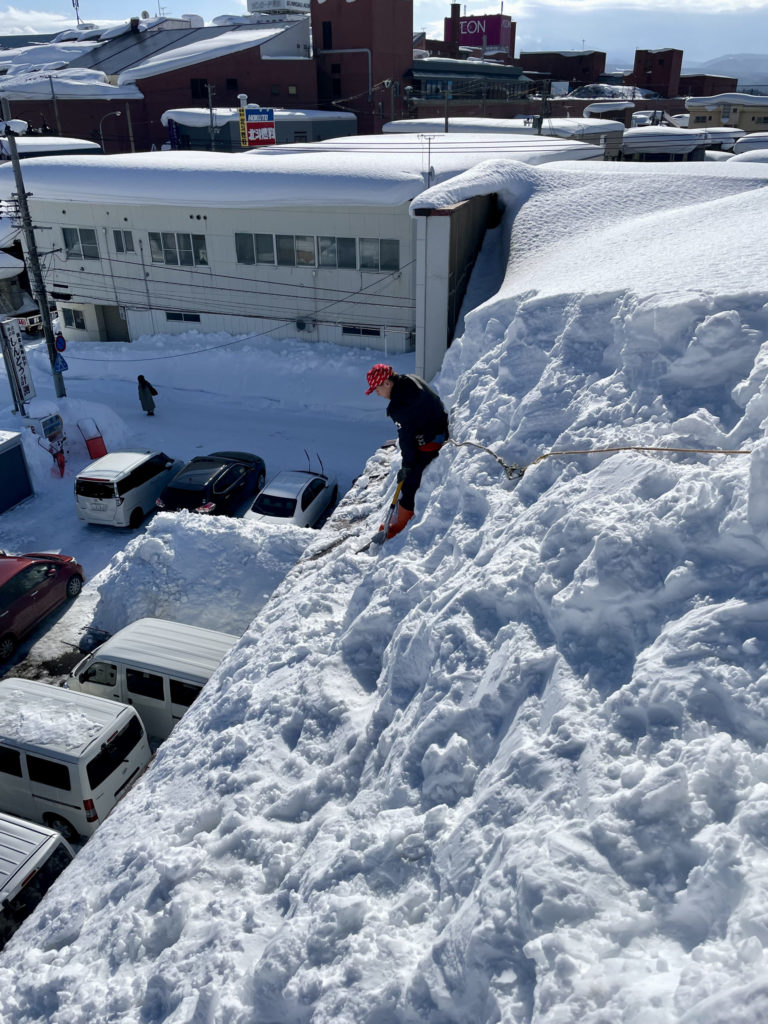 2026年2月初旬時点の青森市は、平年の約2.5倍となる170cm超の積雪を記録する災害級の大雪に見舞われています。今回は特に積雪量が多いということもあり、雪庇部分の除去を主な目標として執り行いました。